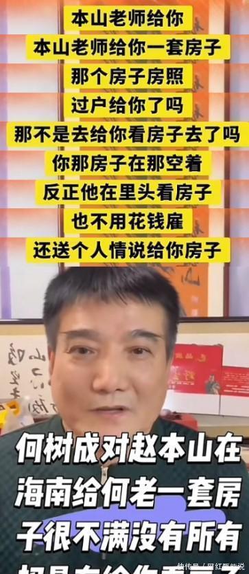 因为在此之前,何树成发视频“内涵”了赵本山。 起因是赵本山送了一套海南的房子给何庆魁养老,何树成不但没有半点感激之心,还说赵本山表面一套背后又是一套。 因为赵本山送给何庆魁的房子并没有过户,因此何树成觉得赵本山只是想免费找人帮他看房子。 这样的做法,不仅省下了雇人看房子的钱,还顺带卖了一个人情。