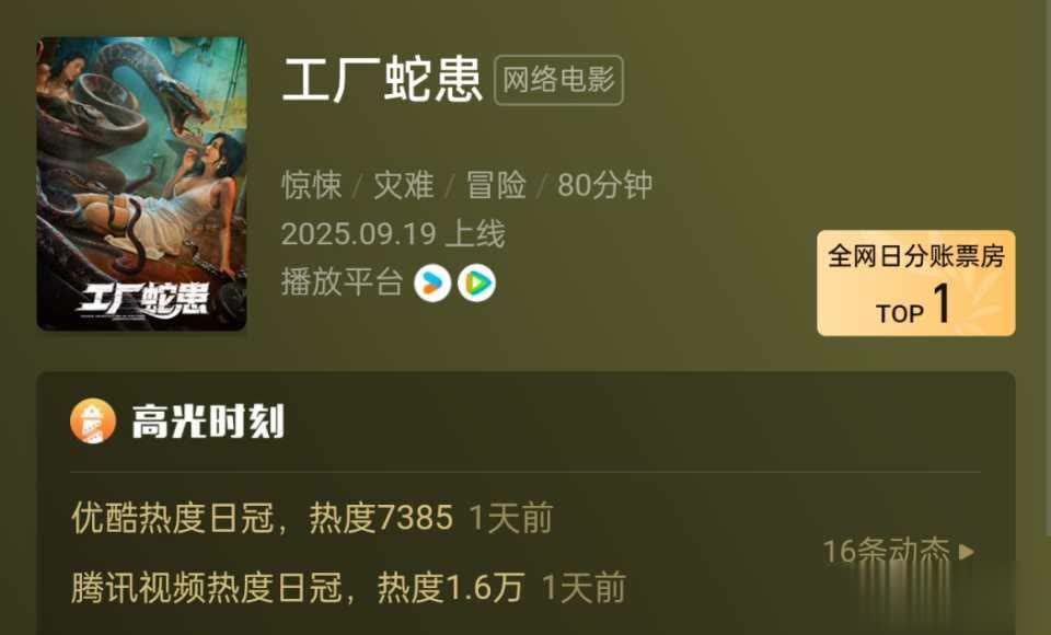 最近刷短视频,突然刷到一部叫《工厂蛇患》的网大,冲上了票房榜第一,以前网大不是拍港片警匪就是鬼怪僵尸,这次居然拍了灾难片,还火了。